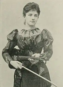 Through her earlier years her musical training was fraught with difficulty. She lived in Portland, Maine, with no teacher of the violin nearer than Boston. Once or twice a week, when only a child, she made her trips to that city, where Prof. Julius Eichberg gave her her first instruction. She was often called upon to play before audiences in Maine, and on one of these occasions her uncle, Dr. Hawkes, of New York City, was so impressed with her talent that he proposed that she should go to the metropolis, where she could pursue her literary and musical studies without interruption. She went and was at once placed under the care of the late Dr. Damrosch. After his death she studied with Prof. Listemann, Prof. Dannreuter, Prof. Bouis and Camilla Urso. For ten years she studied earnestly, and she is to-day an example of what a woman may accomplish by determined effort. She is well known in musical circles as one of the most conscientious and painstaking musicians in the country. She has played in nearly every city in the United States. During the past season she played two hundred-fifty nights in succession, and more than a quarter of a million people listened to her playing. She now makes her home in New York City.