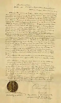 In witness whereof, I have hereunto set my hand, and caused the Seal of the State of Oregon to be hereunto affixed this 30th day of November 1912.