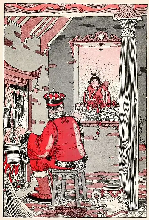 With that he cut the catgut and disappeared, and Massang could hear the three talking together and then moving away. All night long he could hear them coming and going. Evidently they were bearing away the treasure. When morning came, there was not a sound, and Massang knew that he was quite deserted. He sat down on the floor of the cave and buried his face in his hands, and his heart was very heavy. But after a while he got up and looked around, thinking that he would not despair until he had made sure there was no possible way of getting out of the cave. A careful search showed him there was nothing left to make use of but a handful of neglected gold and three cherry pits. These he picked up. "It is my last and only hope," he thought, and aloud he said, "By all the power of good magic, I wish that I may find a way out of this cave to light and freedom." Then he buried the cherry pits directly beneath the mouth of the cave. Scarcely had he done so when a great wave of drowsiness came over him and, lying down on the ground, in a few moments he fell into a deep, dreamless sleep.