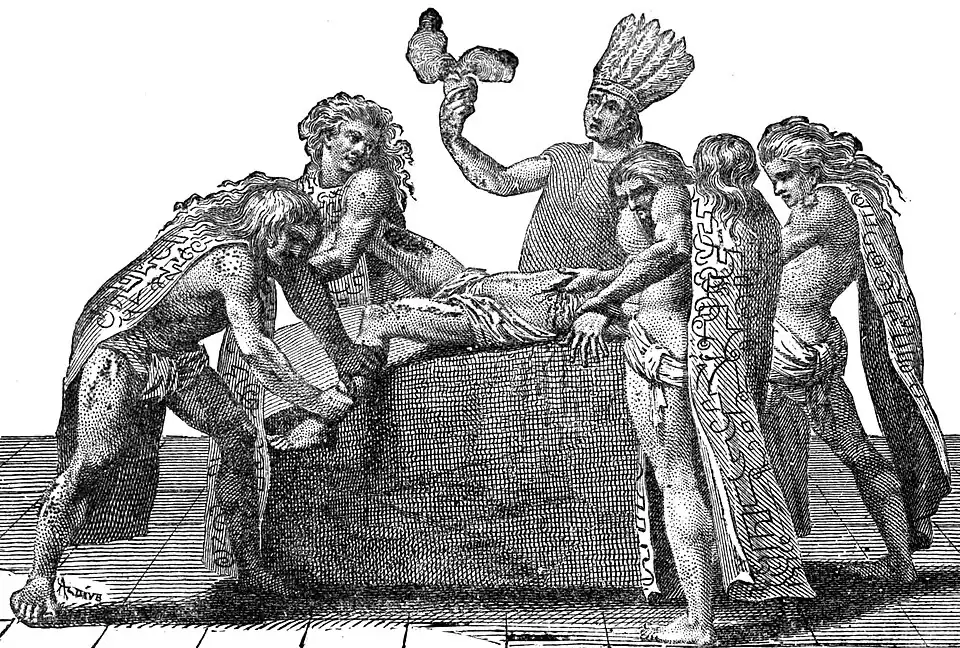 There were two kinds of sacrifice, one performed by the priests, in which the victim was stretched upon the convex surface of the great sacrificial stone, his hands and legs held by four attendants, while the chief priest cut open the protruding breast and tore out the yet palpitating heart. This was offered to the god, either by being thrust between his lips in a golden spoon, or roasted on the coals before him, and the body was thrown down the steps of the great temple-pyramid to the people assembled below. This ceremony took place on the summit of the great teocalli.