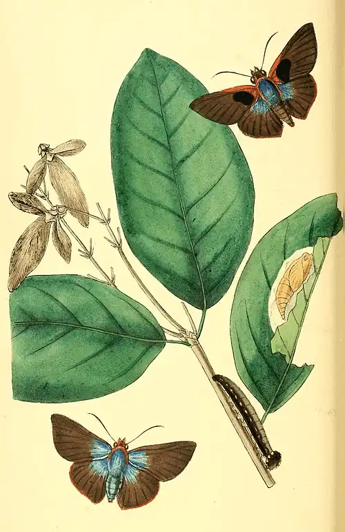The resplendent and changeable azure blue which ornaments the body and part of the wings in this very singular insect, can be but ill expressed in the figure. It is one of the many new and interesting subjects in entomology discovered in Java by Dr. Horsfield; and by his kindness and liberality I am enabled to add the figures of the caterpillar and chrysalis, which were copied out of a fine series of drawings made in Java under his own eye: they do not appear to differ in their formation from others of this family, although the perfect insect possesses such striking and peculiar generic characters; one of the many facts which prove the impossibility of making the Larvæ a primary consideration in forming the genera of Lepidoptera.