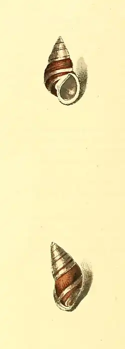 - Shell smooth, conic, of five volutions, the last somewhat distorted; white, with two unequal ferrugineous bands; body whirl rufous, with two white bands. Aperture white.