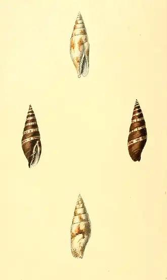 - Shell very smooth. Spire elongated, chesnut-brown; base of the spiral volutions with a whitish band, which is central on the basal whorl. Pillar four-plaited.
