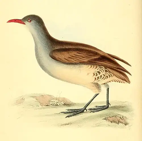 Total length (excepting the legs) eight inches and a quarter. The bill is one inch one line long from the gape, and, with the irides, is red. The head and neck above blackish cinereous; the crown much darker and tinged with brown, the rest of the upper plumage uniform reddish-brown; the edges of the wing-covers tinged with pale cinereous; the spurious wings and quills greyish-brown; the chin is white, changing on the throat, neck, breast and their sides to a pale lead-colour, which, on the body, again becomes white; the feathers on the flanks are blackish or rufous, beautifully margined all round by white, with another internal mark of the same kind; those on the vent are similarly marked, but on a pale rufous ground; the thighs are rufous-white; the under tail-covers rufous, marked by narrow undulated concentric lines of black, the ends whitish. The length of the legs (from the knee to the base of the middle toe) one inch two lines, and from that to the tip of the claw one inch. Legs blueish-purple. Hind toe very short, and elevated above the ground.