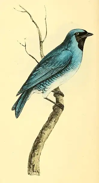 - (Male) blue; front, throat, and temples black; middle of the body beneath white, the sides with blackish transverse striæ.