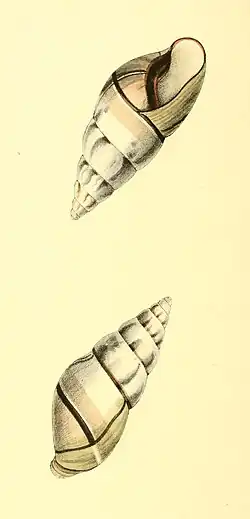 - Aperture reversed: spire lengthened, of seven volutions, the apex truncated, whiteish with clouded cinereous stripes; central band on the basal volution, pillar, and margin of the outer lip chesnut; mouth within white.