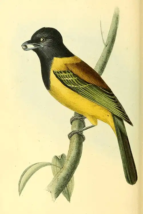 - Head, neck and fore-part of the breast hooded with black; back brown, wings and tail black; tip of the wing-covers, sides of the breast and body beneath yellow; head subcrested.