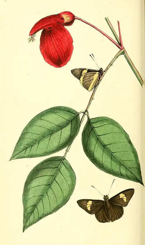 - H. (Div. 2.) Wings above blackish-brown, beneath paler, base fulvous. Anterior with a three-cleft yellow spot. Posterior beneath with a fulvous outer margin and longitudinal line. Thighs rufous.