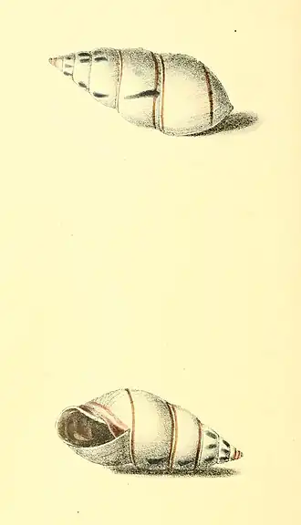 - A. Shell cinereous-white, with two narrow brown bands, spire elongated, straight; volutions seven, slightly ventricose, inner lip rosy, base of the columella straight, entire, aperture ovate-oblong.