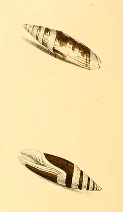 I introduce the description of this diminutive and undescribed shell from its affinity with the last, and as forming a most interesting transition from the Mitres to the Olives: agreeing with the former in the structure of the pillar and the sculptured spire, and with the latter in its general form and prima facie appearance. Its perfect resemblance, in fact, to a small olive, may have occasioned its being hitherto overlooked. The spire is slightly wrinkled and striated; the teeth on the pillar very near each other, slender, and four in number. The colour pale yellowish; the mouth darker, and the tip and base purple. The whole shell is scarcely half an inch long.