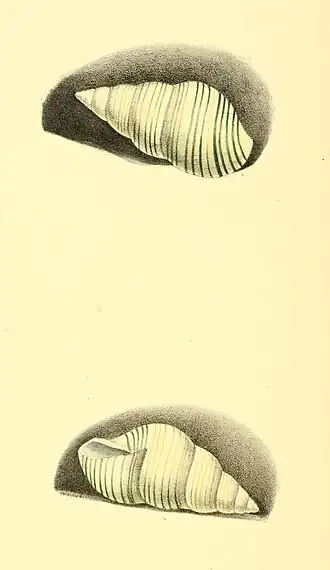 - A. (Div. 2.) testâ albâ, fasciis viridibus capillaribus; spirâ elongatâ, subattenuatâ, anfractibus 6 convexis, labio exteriore crenato; basi subtruncatâ.