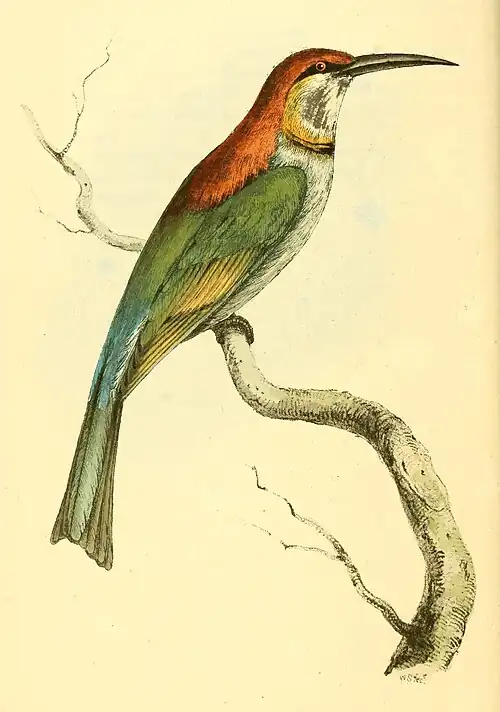 - M. viridis, infra pallidior; capite, collo suprà rufo; mento, jugulo, sulphureis; lineâ temporali et torque colli nigris; tegminibus uropygioque cœruleis; caudâ subfurcatâ.