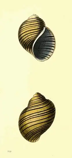 - Shell globose, umbilicated. Spire depressed or very short. Aperture entire, large, oval. Operculum shelly or horny. Animal fluviatile.—Generic Type Helix ampullacea Lin.