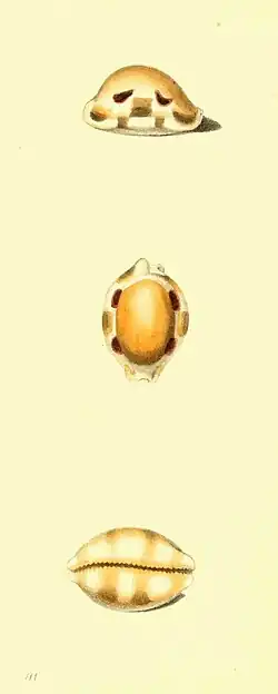 - Shell obtuse, gibbous, orange, the sides with alternate tessellated spots of white and brown.