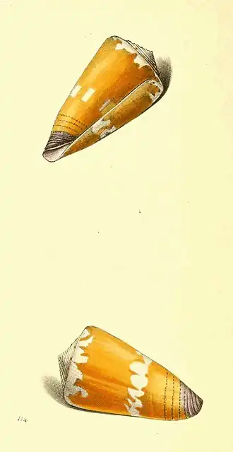 In form it approaches nearest to Conus vitulinus of Bruguiere, having the spire not quite depressed, each volution being slightly raised above the last, gradually to the apex; the upper margin of the body whorl is convex: each volution of the spire has a broad and deep groove nearest the upper edge, which thus becomes elevated, while the convexity of the lower part of the whorl forms a channel round the suture, which separates it from the next; this formation of the spire is very remarkable, and unlike what I have seen in any other Cone. Another distinguishing character is, that the whole shell is crossed by very faint, broad, and almost imperceptible punctured lines, very near each other; in some parts discernible with the naked eye, in others almost obliterated by the longitudinal lines of growth: the granulations towards the base are very sharp and nearly white, and the base itself crossed with rough, thick-set, elevated striæ. No doubt the colour of this species will be found to vary, when more specimens are discovered. The only one I have ever seen, came with some other very rare shells from Amboyna, and is in my own collection.