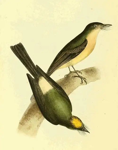 The figures are of the natural size, the upper representing the female, and the lower the male bird: the head of the former is entirely destitute of the crest which distinguishes the latter; in every other respect the resemblance is uniform. This crest, when not erected, is concealed, being nearly covered by the olive feathers around it. When erected, however, it discloses a stripe down the middle of the head of deep straw-coloured feathers, some of which are tipped with olive. The upper mandible of the bill is triangular, and much hooked, notched, and depressed; the colour is black, the perforations of the nostrils are rather large, and would be naked, were they not partially covered by numerous stiff bristles, which spring from the base of the bill and angle of the mouth; between the eye and bill a pale stripe. The plumage above is dull olive green, with a broad band of very pale yellow across the rump. Wings and their covers brown; tail and upper covers blackish; beneath, the plumage is yellowish, the chin almost white, and the breast and vent tinged with ferruginous; the two first quill feathers are progressively shorter than the third and fourth, which are equal, and longer than the others. Legs and claws short, slender, and pale.