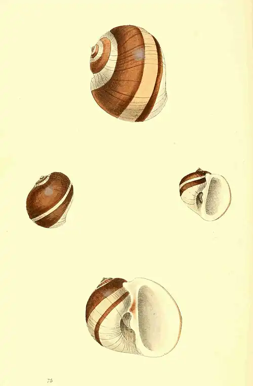 - Shell sub-globose, striated near the suture, brown, banded with white and fulvous; outer lip above slightly emarginate; umbilicus large, open; pillar termination nearly obsolete.