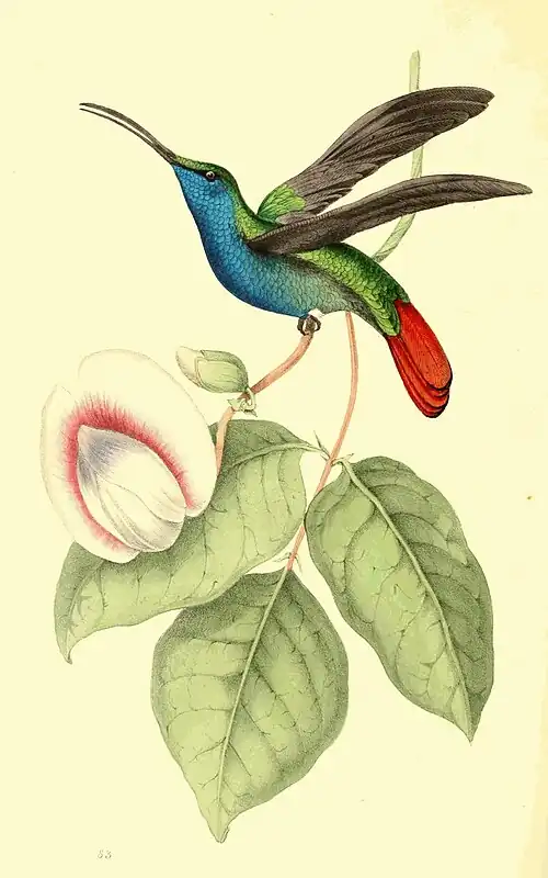 Of this rare and unrecorded species, a fine example existed in Mr. Bullock's Museum, which was purchased to enrich that of Paris: another, more imperfect, was sent Mr. Falkner from the Spanish Main. The male of T. latipennis is undescribed, Dr. Shaw having only seen the female; both sexes, however, are in my possession. The plant introduced in the plate (Clitoria Plumieri) is a native of Brazil.