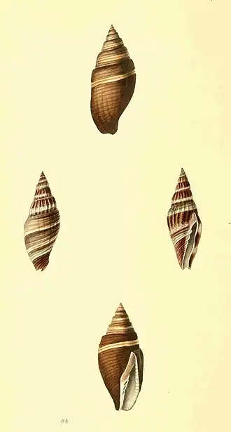 - Shell fusiform, reddish brown, with whitish bands; smooth; spire plaited and striated; base rugose; pillar 4 plaited.