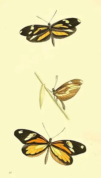 This is the only species among those I have united under the genus Licinia, which has any shade of red mixed in the colouring, all the others being variegated only with white, yellow, and black. It is a native of Brazil, and according to Godart of Guyana and the Antilles: though not common, it is sometimes frequent in local situations, preferring the borders of deep forests, and flying very slowly. I had the means of fully ascertaining the two sexes, of which the two upper figures are of the male, and the lower one the female. There can be no doubt the latter is the Pieris Amphione, so admirably described by M. Godart, who, however, makes no mention of the black marginal spots on the under side of the posterior wings, represented in Cramer's figure, which may therefore be a variety. More difficulty, however, exists in ascertaining if the male is distinct from P. Laia, of Godart: the figures of Cramer, in general, are so inaccurate, as always to excite a doubt in cases of nice discrimination; Godart's description, nevertheless, perfectly agrees with Cramer's figure: if it was, therefore, drawn up from the insect itself, there can be little doubt that Laia is distinct from Amphione; if, on the other hand, M. Godart made his description only from Cramer's figure, the question remains in its original uncertainty.