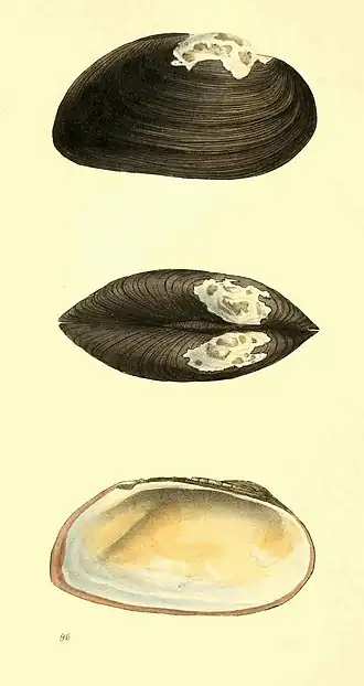 - Shell transverse, generally thin. Hinge consisting of a simple marginal lamina without teeth, smooth or slightly raised, terminating at the anterior end in a curve or sinus below the ligament. Muscular impressions three. Ligament external. Animal fluviatile.