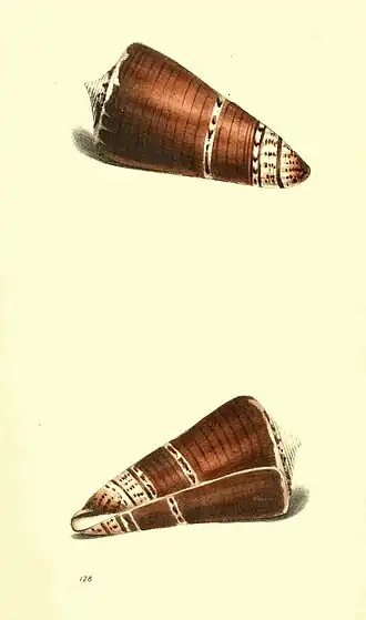 - Conus Maldivus. Var. B. testâ castaneâ, fasciâ albescente mediâ angustâ ornatâ; anfractûs basalis basi et margine albis.