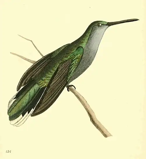Both the birds are represented the size of life, and may be included in one description: the upper plumage obscure blueish green, glossed with a coppery or golden tinge and shaded with brown, the plumage beneath entirely grey; ears and sides of the neck the same, the latter with some spots of greenish. Tail large, even, and broad; the two middle feathers green, tipt (in the male) with blackish; the next pair black, with the base green, and the extreme points whitish; the remainder black, with their ends more or less white. Wings violet brown, the shafts of the three outer quills, in the male, dilated and compressed, but simple in the female. Said to inhabit Cayenne. Although the bill of this species is all but straight, it belongs naturally to the curved-bill division.