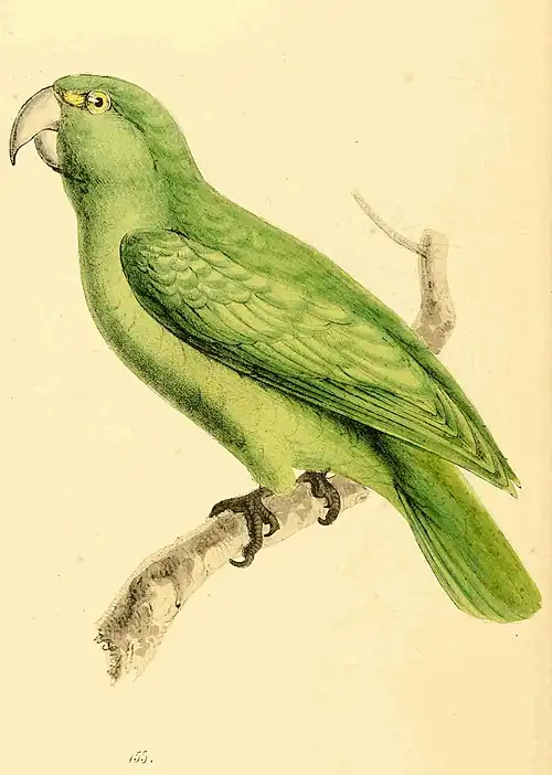 The uniform green which pervades the plumage of this Parrot, induces me to think it may, possibly, be the female of some other species; a few pale red feathers, close to the axilla, and the faint red on the tail feathers, appear to strengthen this supposition. Among those species which are recorded, this approaches nearest to Latham's Green Parrakeet; but the figure this writer quotes, (Pl. Enl. 837.) is at variance both with his description, and with the bird now before us; it may, therefore, be considered as undescribed.