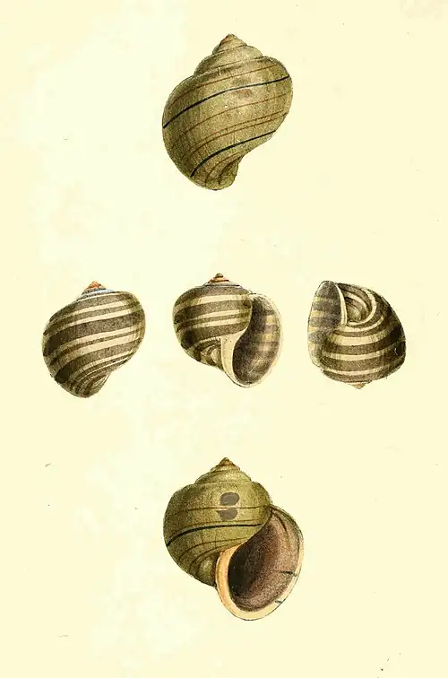 - Shell globose, smooth, with purple brown bands; spire depressed, the tip prominent; aperture narrow; umbilicus large, deep; pillar obsolete.