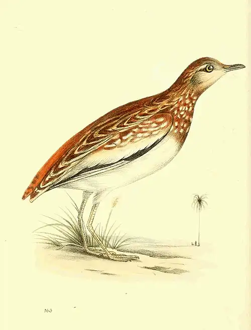I have represented this delicate little bird of its natural size; which is so small, as scarcely to equal that of a Lark. The Turnix inhabits the sandy deserts of Africa and India, and seems to form a race of pigmy Bustards, all the species yet discovered (fourteen in number) being very diminutive. Little is known of their habits in a state of nature, further than that they migrate, and fly with great rapidity. The specific character will distinguish H. nivosus as a species; and I have already given a more detailed description of it in the Journal above quoted. Mr. Leadbeater received it from Senegal.