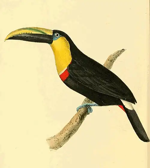 The species now selected is one I have never seen; but I have no doubt of its existence, and little of the accuracy of its delineation. I before alluded to several drawings of Toucans which had come to my hands, executed by an unknown artist: among them is a figure of that now published; with a note subjoined, stating it was drawn "from the bird just dead." The other drawings of the same artist represent several of the common species, and their accuracy is presumptive evidence that this also is represented correctly. The singular colouring of the bill at once separates it from all known species; and for its further history, we must trust to the exertions of those travellers, visiting South America, who may feel an interest in illustrating these singular birds.