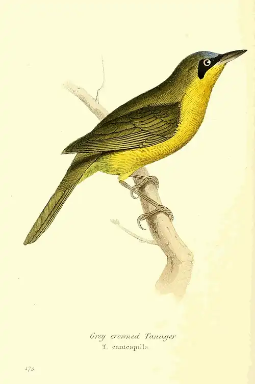 M. Temminck proposes to unite with the Tanagers, several birds scattered in the Linnæan Genera of Lanius, Loxia, Fringilla, Pipra, and Motacilla. This view of the subject, it may not be superfluous to add, is in perfect unison with my own. In fact, I had meditated a similar arrangement; but the appearance of M. Temminck's work rendered the publication of my own remarks no longer necessary. The bird here figured belongs to that division which forms a transition to the Sylviæ, from which they are readily distinguished by the thickened base of the under mandible. It is not uncommon in the West Indies; but I cannot find it described either among the Tanagers, Finches, or Warblers of the Linnæan school: in this, however, I may possibly be mistaken. It is represented the size of life, and is sufficiently distinguished by its specific character.