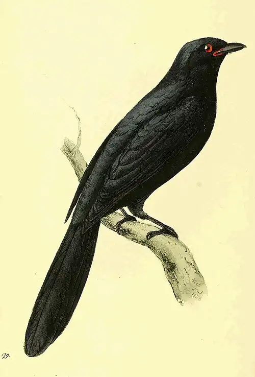 The figure is rather less than the natural size; the whole plumage deep black; glossed with bluish green in every part but the quill and tail feathers; the quills inside are grey, margined with olive; the first of these is very short, the second and third shorter than the fourth, and the two next are nearly of equal length. The tail has ten feathers, and is even, except the two outer pair, which are progressively shorter. The bill rather thick and strong, the culmine not very apparent, the upper mandible strongly notched, the under but slightly; the nostrils are hid by thickset incumbent feathers, mixed with hairs; these cover the aperture, which is rather large, round, and encircled by a narrow membrane. The legs are very short, the three fore-toes united as far as the first joint, the hind-toe short; the claws of all are small, and the sole of the foot perfectly flat, like the Bee-eaters. I have been minute in noting these characters, because, although the bird will stand at present in the great family of the Flycatchers, there is no doubt they will hereafter be divided into distinct groups.
