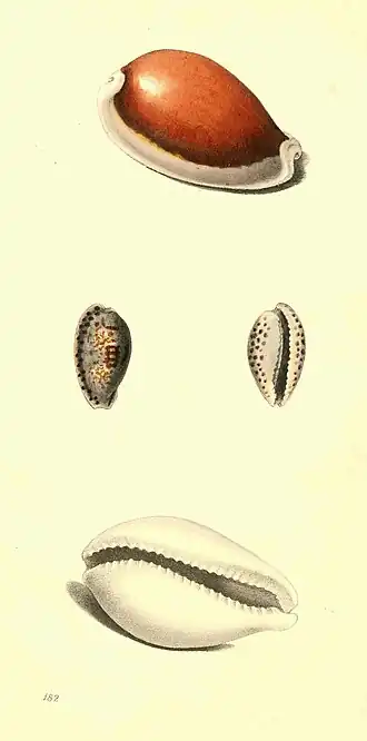 In shape and general aspect this shell somewhat resembles C. onyx; but its colours are so peculiar, that it cannot be mistaken for that or any other known species: the under side (or belly) is convex and pure white; the sulcations between the teeth of the aperture wide, short, and but faintly marked; the sides livid, tinged with flesh colour. Three specimens have fallen under my observation; one of which, being young, showed the internal colour of the back to be dull purple; they were all received by Mrs. Mawe from the South Seas.