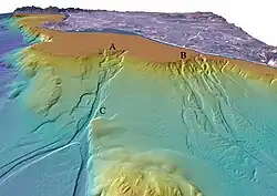 "Perspective view looking north over the San Gabriel (A) and Newport (B) submarine canyons. The distance across the bottom of the image is about 17 km with a vertical exaggeration of 6x. Both canyons formed when the San Gabriel River and the Santa Ana River flowed out across the Los Angeles Basin and offshore shelf when it was exposed during lower eustatic sea level. Newport Canyon begins less than 360 m from shore at the north end of Newport Harbor and is composed of individual channels that braid down the slope over a width of about 9 km. San Gabriel Canyon begins as a series of channels that join together midway down the slope and then split into two channels at the base of the slope. The width of San Gabriel Canyon at "C" is 815 m and incises about 25 m into the slope. Lasuen Knoll can be seen in the forground."[5]