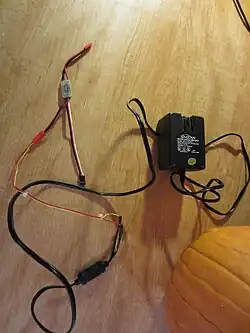 In order to proceed with a test of the prototype, a means of powering the fan was needed. The voltage source was a modified Ac adapter from a laptop, which was within the voltage and current constraints outlined in the specifications of the Zagi 5 electronic speed controller. The Zagi 5 would control the current output to the brushless motor. The power leads from the Zagi 5 were then attached to the motor mounted on the prototype. The ESC did not provide power to the motor. When the motor was connected to the ESC power leads for the RF receiver, the fan started to spin, but after a second or two it started to make a grinding noise. The ESC power leads were not able to supply power to the motor because there was no means of providing it with an initialization signal.