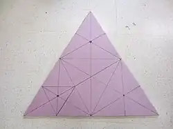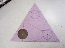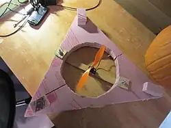 A small-scale prototype of the craft was built to gain insight into the project's scale and construction method. This prototype revealed that the scale of the craft was going to be much larger than initially suspected in order to accomodate the span of the fan propellers. The main craft body was constructed out of 0.75" thick pink insulation foam. It was made from four triangular pieces that formed a 46" equilateral triangle, and was two sheets thick (1.5"). 8.5" holes were cut at the three corners as ducts for three fans, and the top edges of the craft body were beveled to decrease drag on take-off.