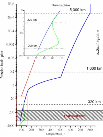 The middle layer of the Uranian atmosphere is the stratosphere, where temperature generally increases with altitude from 53 K in the tropopause to between 800 and 850 K at the base of the thermosphere.[75] The heating of the stratosphere is caused by absorption of solar UV and IR radiation by methane and other hydrocarbons,[76] which form in this part of the atmosphere as a result of methane photolysis.[68] Heat is also conducted from the hot thermosphere.[76] The hydrocarbons occupy a relatively narrow layer at altitudes of between 100 and 300 km corresponding to a pressure range of 10 to 0.1 mbar (1000 to 10 kPa) and temperatures of between 75 and 170 K.[67][69] The most abundant hydrocarbons are methane, acetylene and ethane with mixing ratios of around 10−7 relative to hydrogen. The mixing ratio of carbon monoxide is similar at these altitudes.[67][69][71] Heavier hydrocarbons and carbon dioxide have mixing ratios three orders of magnitude lower.[69] The abundance ratio of water is around 7×10−9.[70] Ethane and acetylene tend to condense in the colder lower part of stratosphere and tropopause (below 10 mBar level) forming haze layers,[68] which may be partly responsible for the bland appearance of Uranus. The concentration of hydrocarbons in the Uranian stratosphere above the haze is significantly lower than in the stratospheres of the other giant planets.[67][14]