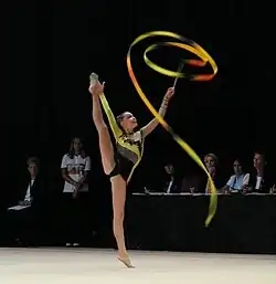 Rhythmic gymnastics (short:RG) is a sport in which individuals or teams of competitors (generally five) manipulate one or two apparatus: rope, hoop, ball, clubs, and ribbon. Rhythmic gymnastics is a sport that combines elements of ballet, gymnastics, dance, and apparatus manipulation. The victor is the participant who earns the most points, determined by a panel of judges, for leaps, balances, pirouettes, flexibilities, apparatus handling, execution, and artistic effect.