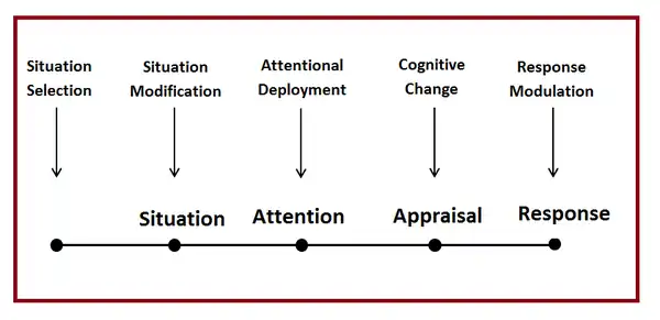 The process model of emotional regulation attempts to describe how different emotion regulating strategies can occur at different points in the emotion generation process. According to the modal model of emotion, the situation leads to attention, which leads to a cognitive appraisal, which then leads to a response (Gross & Thompson, 2007). In Gross's process model, there are 5 different strategies that can be used to manage emotion different stages of the modal model. They can be divided into two main categories (Gross, 2002):