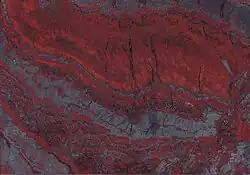 Though they started appearing in the Archean Eon, Banded Iron Formations (or BIFs) became prevalent in the Paleo-Proterozoic. BIFs are cherts that show alternating bands of dark red and light gray. The dark red bands are made up of hematite and magnetite (iron oxide minerals). The light gray bands are chemically precipitated quartz. The formations formed on shallow sea floors as underwater hydrothermal vents dissolved iron and other elements. The iron reacted with the oxygen to form compounds that became part of the sediment on the sea floor. The alternating iron oxide bands correlate to the oscillating levels of oxygen in the Proterozoic atmosphere. When atmospheric oxygen levels were high, free oxygen was able to combine with the iron and make the rust-red color. As oxygen levels dropped, there was no free oxygen to combine with the iron and the gray bands were made. A banded iron sequence near Lake Superior contains an interesting rock formation called the Gunflint Chert. The 1.9 billion year old Gunflint Chert contains prokaryotic organisms and cyanobacteria. Cyanobacteria are prokaryotic, photosynthetic microorganisms that possess chlorophyll and produce oxygen.