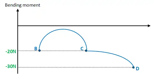 Finally, plot the points on the bending moment diagram. Join all the points up, EXCEPT those that are under the uniformly distributed load (UDL), which are points B,C and D. As seen below, you need to draw a curve between these points. Unless requested, I will not explain why this happens.