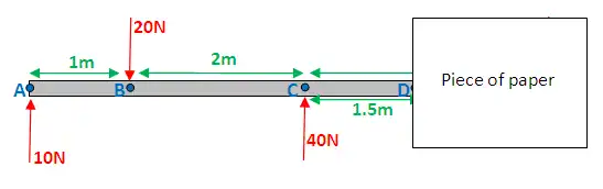 Now, let's do this for point B. BUT - slight complication - there's a force acting at point B, are you going to include it? The answer is both yes and no. You need to take 2 measurements. Firstly put your piece of paper, so it's JUST before point B: