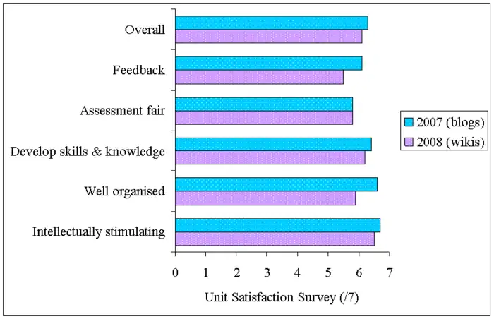 The Unit Satisfaction Survey (USS) results for these units revealed a consistently high level of student satisfaction with both approaches (see Table 1), with Overall and Average student ratings above 6 out of a possible 7 (compared to a faculty average of 5.6 and UC average of 5.5 in 2008). Students appear to have exhibited a preference for the 2007 (blog-based) approach than the 2008 (wiki-based) approach, probably because students found blogs simpler and easier to edit.