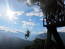 - 🌍 Parque Aventura San Martin, ☏ +593 98 498 6245. Well-run set of cables with competent guides and good name-brand gear. The zipline trip goes once into a crevasse between two rocks at a mild incline, followed by a climb, a rope bridge, and a zipline back to nearly the start point. It's about 10 minutes out of town, and takes 15-20 min to complete the circuit. $20+$5 for some photos and a video.