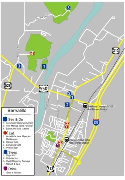 Bernalillo has a few chain motels located along US-550, including a Days Inn and a Holiday Inn. Lodging may be hard to find in October when the Albuquerque International Balloon Fiesta occurs.