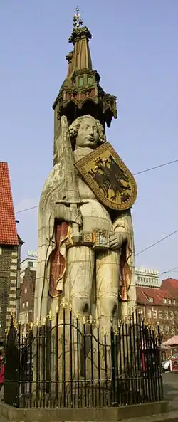 - 🌍 Roland, Marktplatz. This statue on the main square, in front of the town hall, is of the Knight Roland who was a protector of trade. He appears in many European cities especially those involved in the Hanseatic league. Bremen's is considered one of the finest and is included with Town Hall on the World Heritage List. The standing figure is 5.47 m tall.
