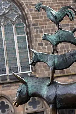 The Bremer Stadtmusikanten (Town Musicians of Bremen) perhaps the most well known figures associated with Bremen are characters from the Brothers Grimm fairy tale of the same name. Their image adorns many of the souvenirs in the city. Next to the Town Hall is a much photographed statue of them.