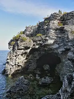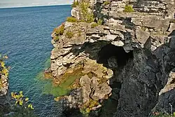 The harder dolostone forms much of the rock of the escarpment cliffs along Bruce Peninsula National Park's Georgian Bay shoreline. At Niagara Falls, the dolostone "caprock" is more resistant to erosion than the rock below it, creating the sculptured cliffs for which the area is famous. Since the last Ice Age, water levels in the region have undergone great changes. Softer limestone has been eroded away by water action, leaving magnificent overhanging cliffs at various points along the shore. These are the big attraction of the Cyprus Lake trails. Where erosion has cut more deeply, caves have been formed, such as the famed "Grotto" on the shore between the Marr Lake and Georgian Bay Trails. Great blocks of dolomite, undercut by wave action, have tumbled from the cliffs above and can be clearly seen below the surface of the deep, clean waters of Georgian Bay.