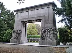 - π British Waterloo Campaign Monument, Rond Punt der Geallieerden. Monument for British officers killed during the Waterloo Campaign of 1815. After being suggested in 1861,the City Council of Brussels approved to donate about 30 mΒ² of cemetery to re-bury British officers whose graves were in or around Brussels, and on cemeteries around the battlefields of Waterloo and Quatre Bras. Queen Victoria personally oversaw the funding of a suitable monument. The sculpture, a design of Belgian artist Jacques de Lalaing, is a large edifice of bronze figures on a plinth of stone blocks. It depicts Britannia with her helmet and trident lowered, surrounded by weapons, uniforms and equipment. Inscribed to the sides of the plinth are shields bearing the names of the regiments that participated in the campaign. The monument was unveiled in 1890, with below it a crypt with 16 niches. It now contain 17 bodies, all of which were transferred here between 1890 and 1894. Of the 17 men, all but one died during the campaign: Sergeant-Major Edward Cotton survived the battle and became a tourist guide to the battlefields after the campaign. He was buried at Hougomont after his death in 1849 and also transferred to the Monument.